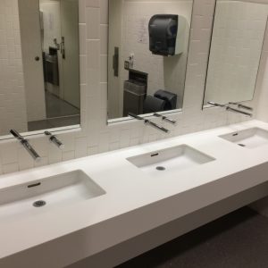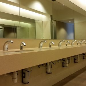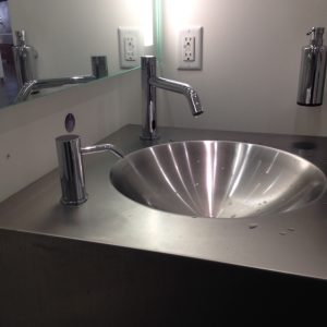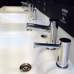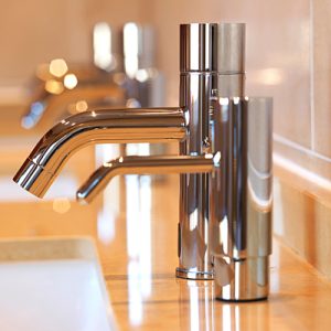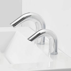 The Smart Duo – touch free faucet & touchless soap dispenser for a germ free commercial bathroom.
