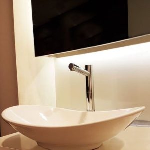 Stern’s behind the mirror solutions has been designed for looks and function. The design is minimalistic and with clean look, while having robust and modern faucet, automatic soap dispenser and hand dryer all hidden behind the mirror.