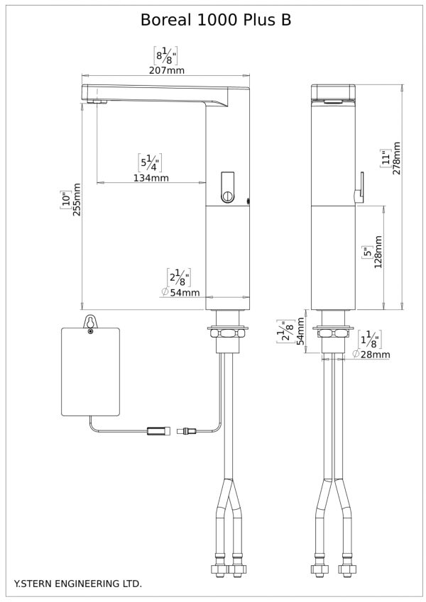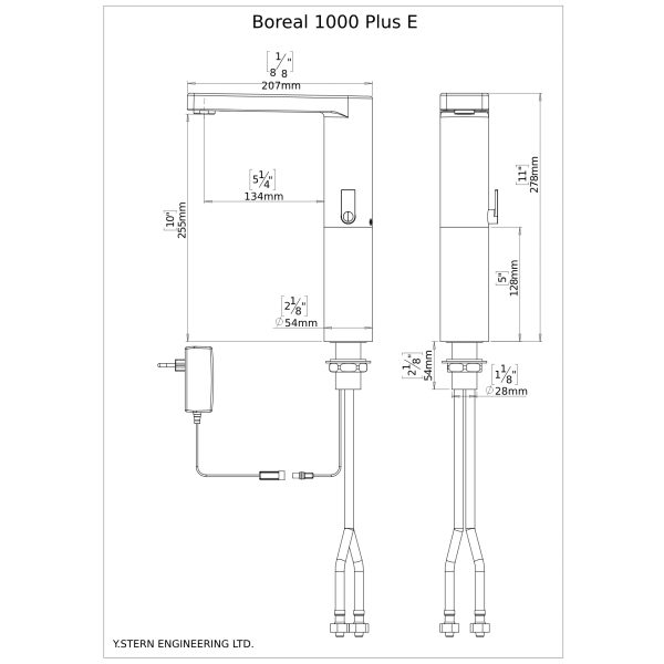 Touch-free electronic faucet for deck-mounted installations. Activated by concealed sensor built into the spout. Solid brass one-piece construction. For cold or premixed water. Filter included. Latching solenoid valve mounted inside the faucet body. Sensor includes a low battery indicator. Adjustable settings by remote control: