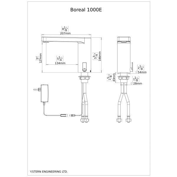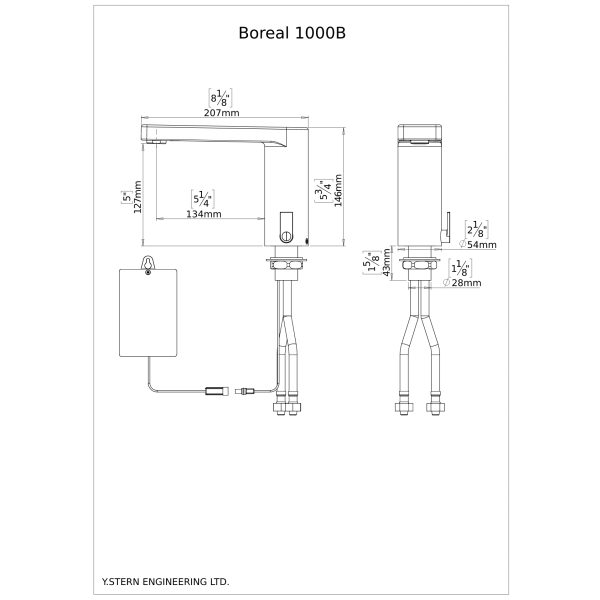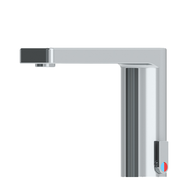 Touch-free electronic faucet for deck-mounted installations. Activated by concealed sensor built into the spout. Solid brass one-piece construction. With mixer for water temperature adjustment for hot and cold water. Filter included. Latching solenoid valve mounted inside the faucet body. Sensor includes a low battery indicator. Adjustable settings by remote control: