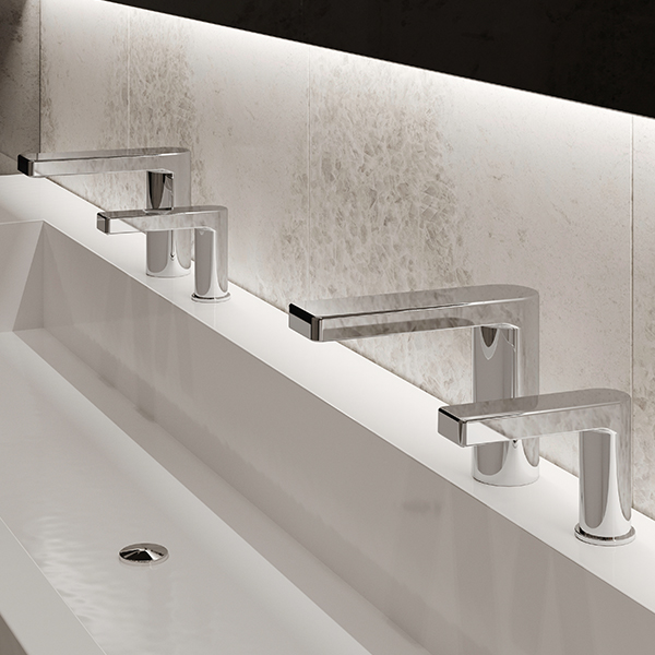 Deck-mounted faucet. Combining an elegant design with vandal-resistant features. Easy installation. Long lasting even in the harshest installation sites. Helps washrooms stay clean and saves water. Prevents cross contamination. Ideal for stadiums, train and bus stations and highway rest stops. Combined with Boreal touch free electronic soap dispenser, it creates a germ-free and automated environment.