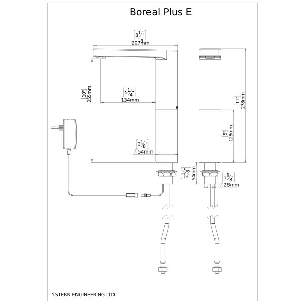 Touch-free electronic faucet for deck-mounted installations. Activated by concealed sensor built into the spout. Solid brass one-piece construction. For cold or premixed water. Filter included. Latching solenoid valve mounted inside the faucet body. Sensor includes a low battery indicator. Adjustable settings by remote control: