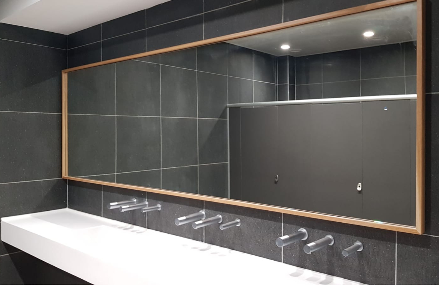 Commercial bathroom faucets and commercial soap dispensers hidden behind the mirror