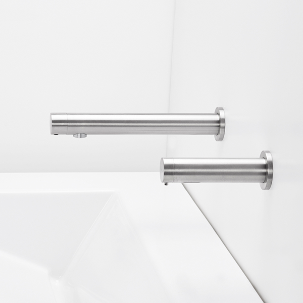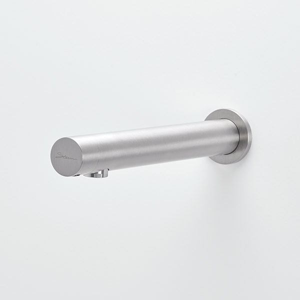 Touch-free wall-mounted electronic commercial tap. Activated by an infrared sensor. For cold or premixed water. Stainless Steel AISI316 body, other finishes available. Adjustable settings by remote control: sensor range, security time, delay in, delay out, on-off and reset to factory settings.