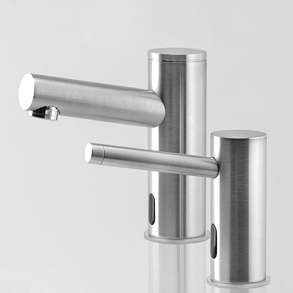 Touch-free electronic commercial tap for deck-mounted installations. Activated by infrared sensor. For hot and cold water. Elite 1000 E AISI 316 includes a mixer for water temperature adjustment and filters. Stainless Steel AISI316 body, other finishes available. The latching solenoid valve is located above deck inside the product for added vandal protection. regular faucet Installation with simple transformer connection. Adjustable setting by remote control: sensor range, security time, delay in, delay out, on-off and reset to factory setting. 24 hours mandatory hygiene flush available upon request.