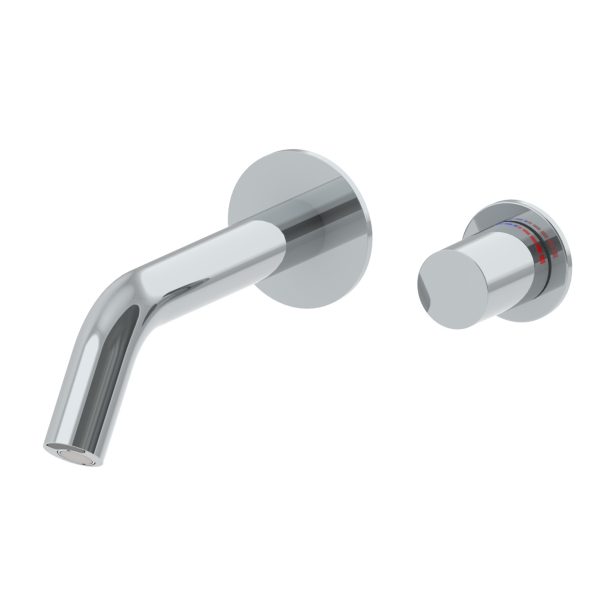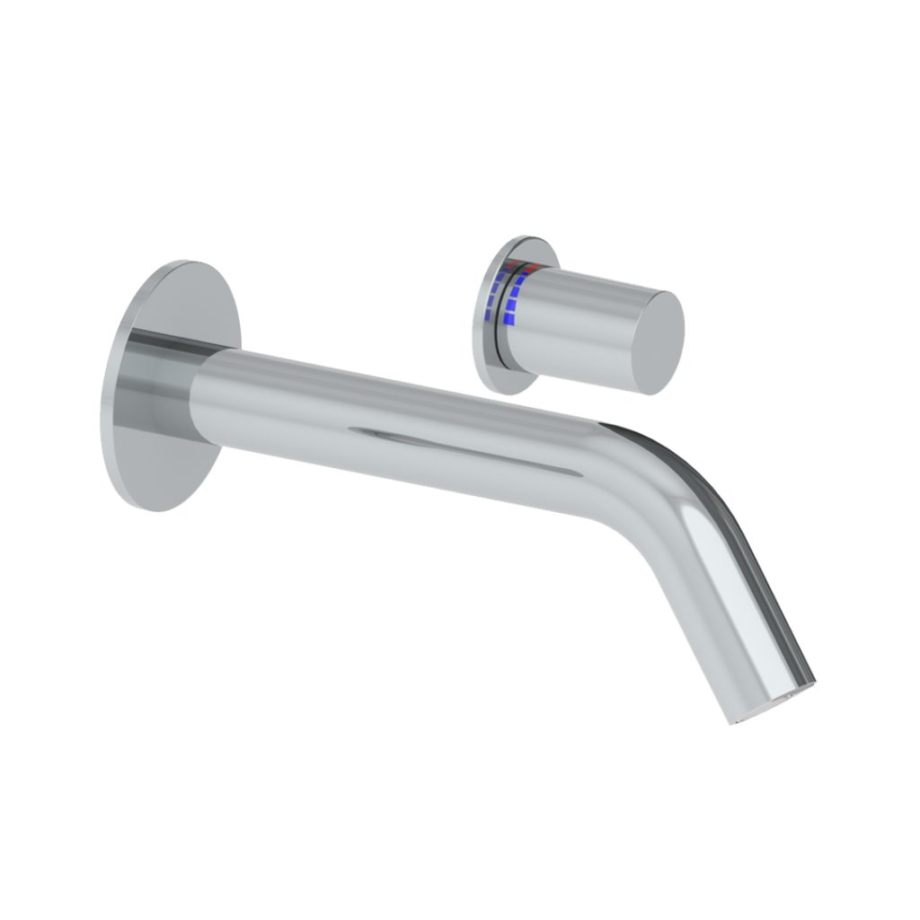 Touch-free wall-mounted electronic faucet. With thermostatic mixer for water temperature adjustment for hot and cold water. Powered by IP67 dual power input box that allows the faucet to be used with 9V battery or 9V transformer. Can be powered by a 9V transformer and an integrated back up system to be used with 9V lithium battery enabling the faucet to be used normally in case of power failure. Chrome plated body. Activated by concealed sensor built into the spout. Filter included.