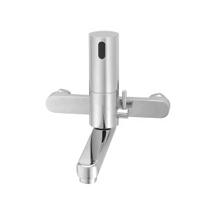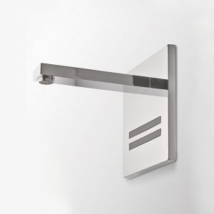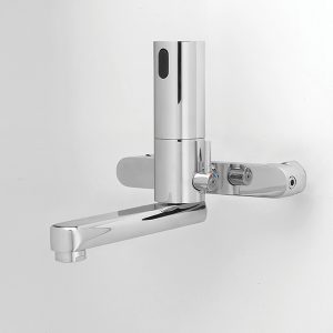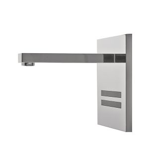 Touch-free wall-mounted electronic commercial tap. For cold or premixed water. Activated by concealed sensor built into the spout. Chrome plated body, other finishes available. Includes a low battery indicator. The Adjustable settings by remote control: sensor range, security time, delay in, delay out, on-off and reset to factory settings.