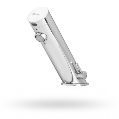 Touch free electronic commercial tap for deck mounted installations. For hot and cold water, the faucet includes a mixer to adjust water temperature and filters. Activated by a nano infrared sensor. Includes a low battery indicator. Latching solenoid valve is located above deck inside the product, which makes it more resistant to vandalism. Solid brass one-piece construction. Sensor range is adjustable manually and by remote control.