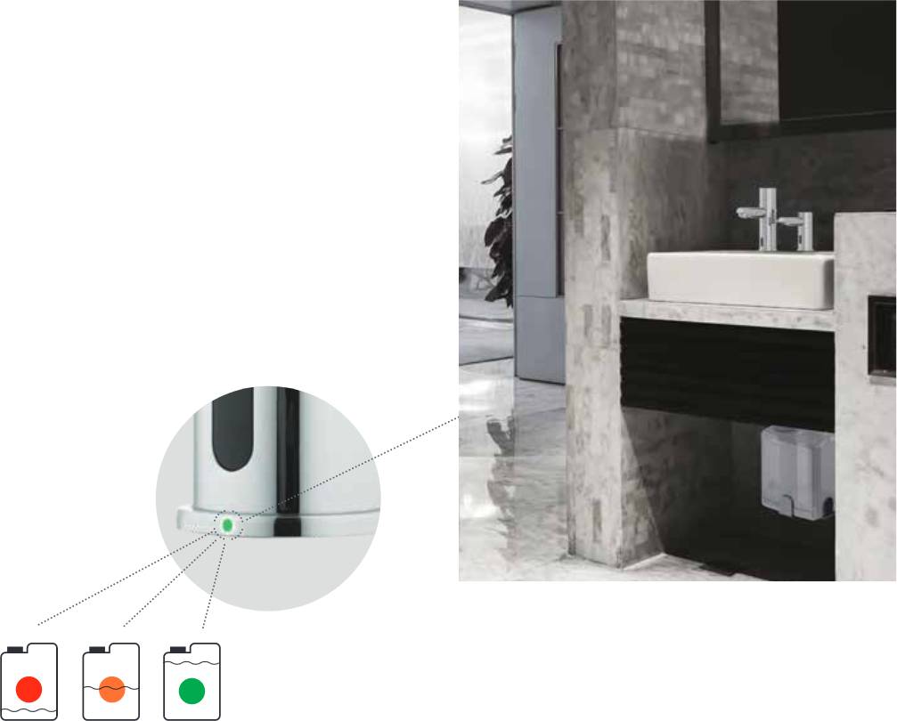 A small LED light in the body of the dispenser lights up green when the soap tank is full, orange when the soap level is low, and red when a refill is needed.