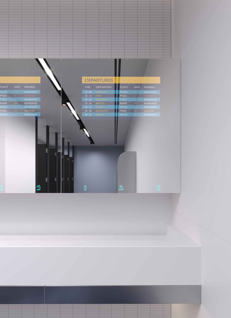With its behind-the-mirror hand washing stations, SWAR TV technology delivers targeted advertising, information, and entertainment to users while they wash their hands.