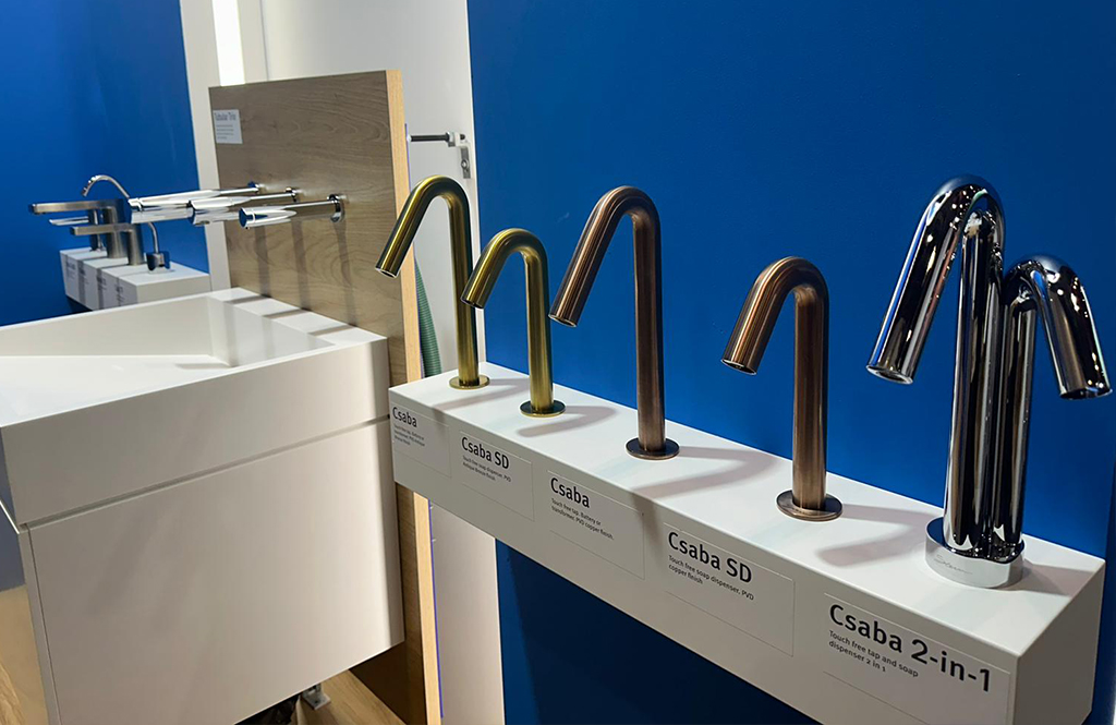 Stern’s booth displayed the Csaba faucet and soap dispenser in various finishes to diverse aesthetic preferences, including Antique Bronze, Matt Black, Copper, Gunmetal and Brushed Nickel. Coordinating special finishes with other elements in the bathroom creates a cohesive and harmonious design. This coordination contributes to a sense of unity and completeness, enhancing the luxurious atmosphere.