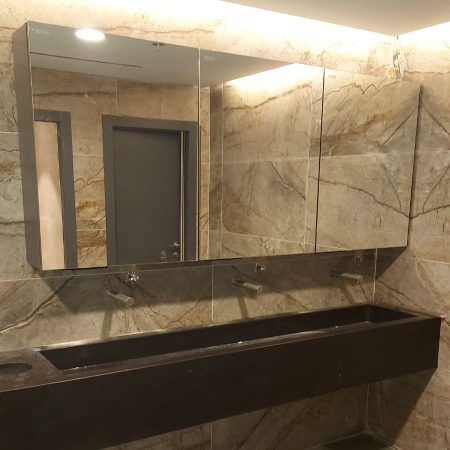 - Complete sanitary cabinet with a lockable mirror – behind mirror soap air dispensers.