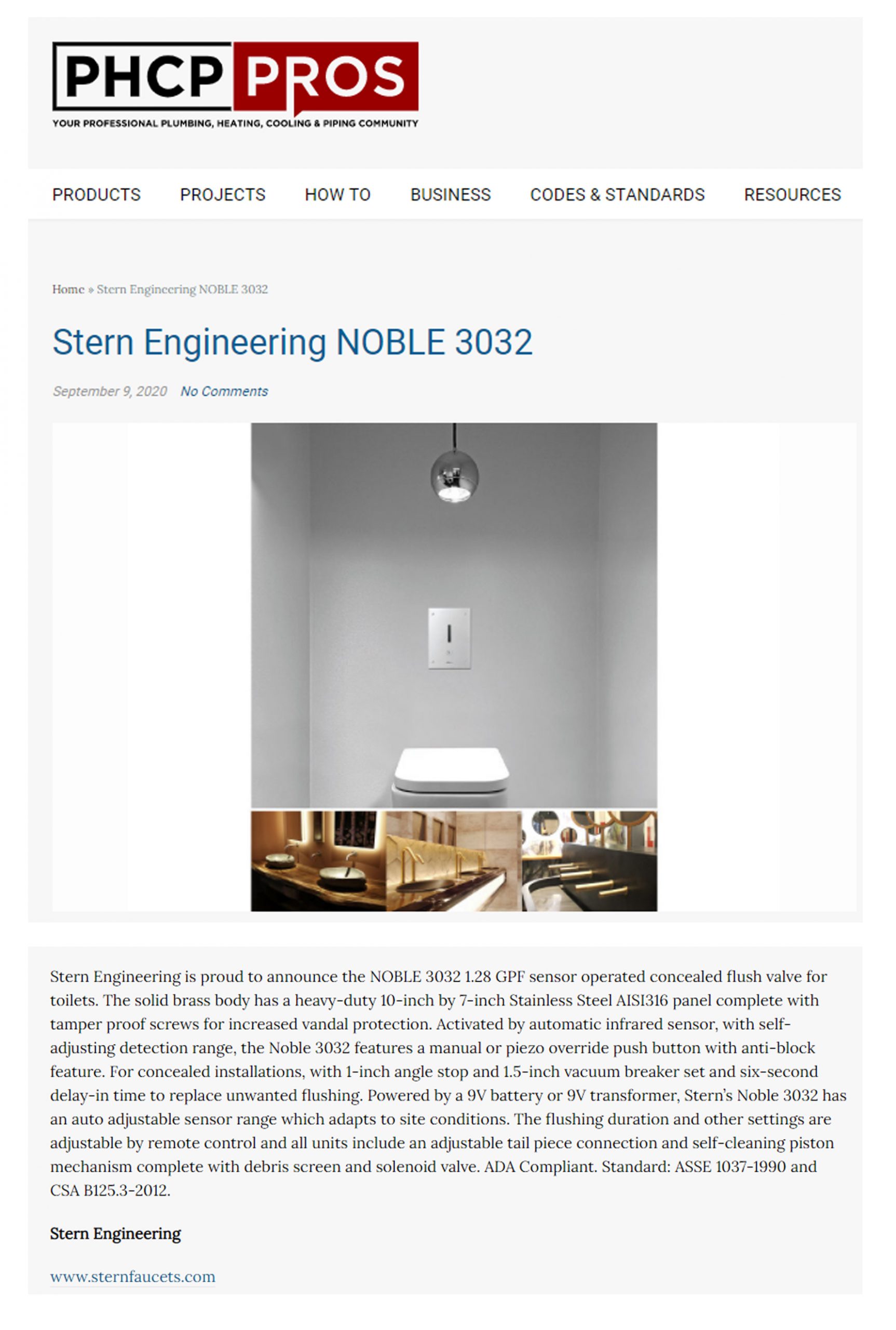 Stern Engineering is proud to announce the NOBLE 3032 1.28 GPF sensor-operated concealed flush valve for toilets. The solid brass body has a heavy-duty 10” x 7” Stainless Steel AISI316 panel complete with tamper-proof screws for increased vandal protection. Activated by an automatic infrared sensor with a self-adjusting detection range, the Noble 3032 features a manual or piezo override push button with an anti-block feature.