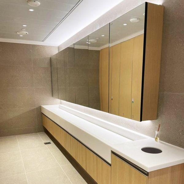 Complete sanitary cabinet with a lockable mirror. Includes high speed hand dryer, mixing valve, touch free faucet, touch free soap dispenser and LED pictograms for intuitive user guidance. Delivered with remote controls to adjust soap dosage, LED colors and other customization settings.