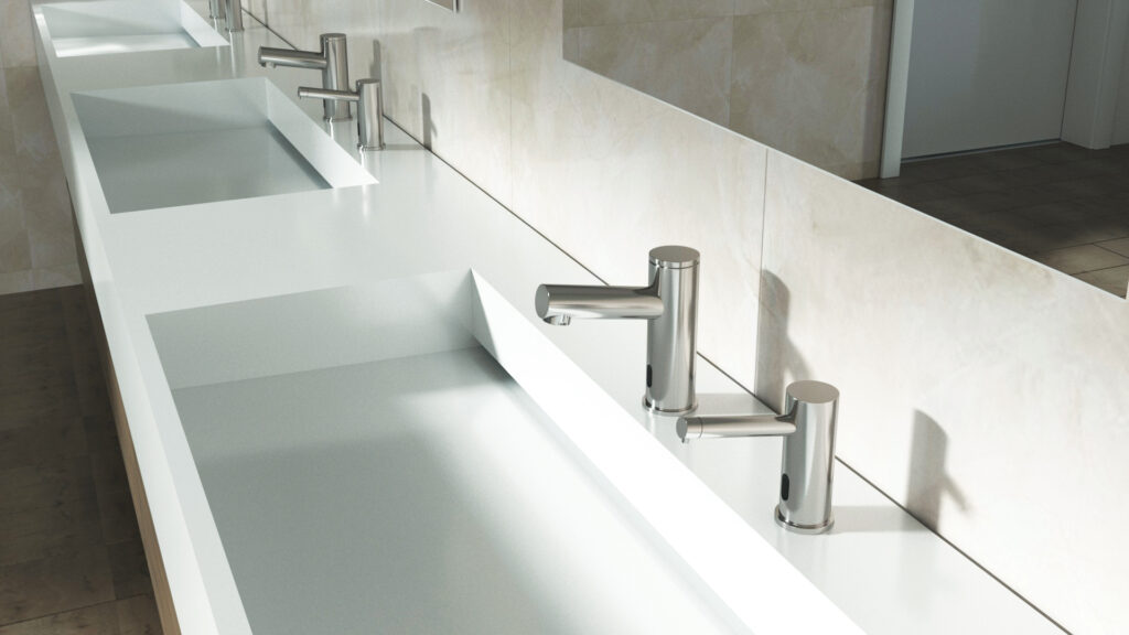 Commercial bathroom – touchless faucets, automatic soap dispensers and hand dryers