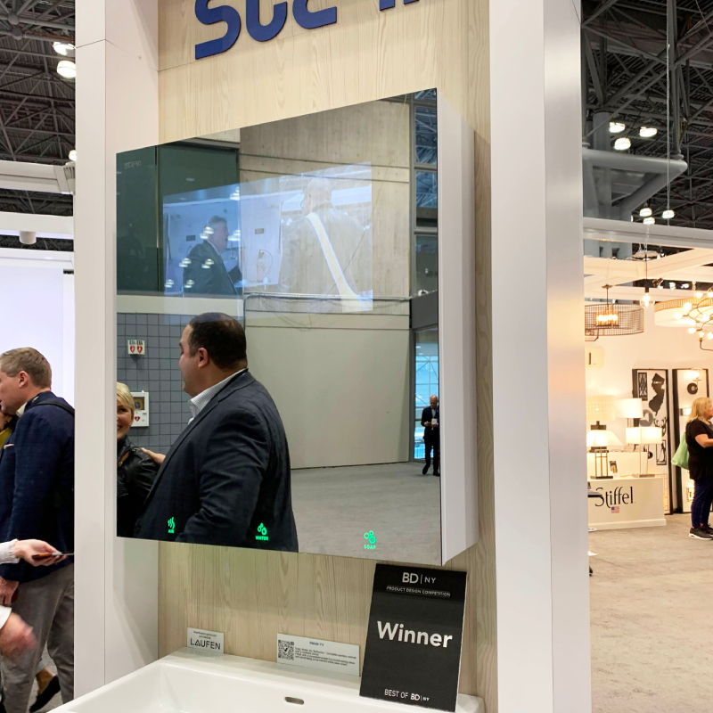 The first thing we can say about our revolutionary mirror monitor is that it won the “Best Product” prize in the Bath category at BDNY.