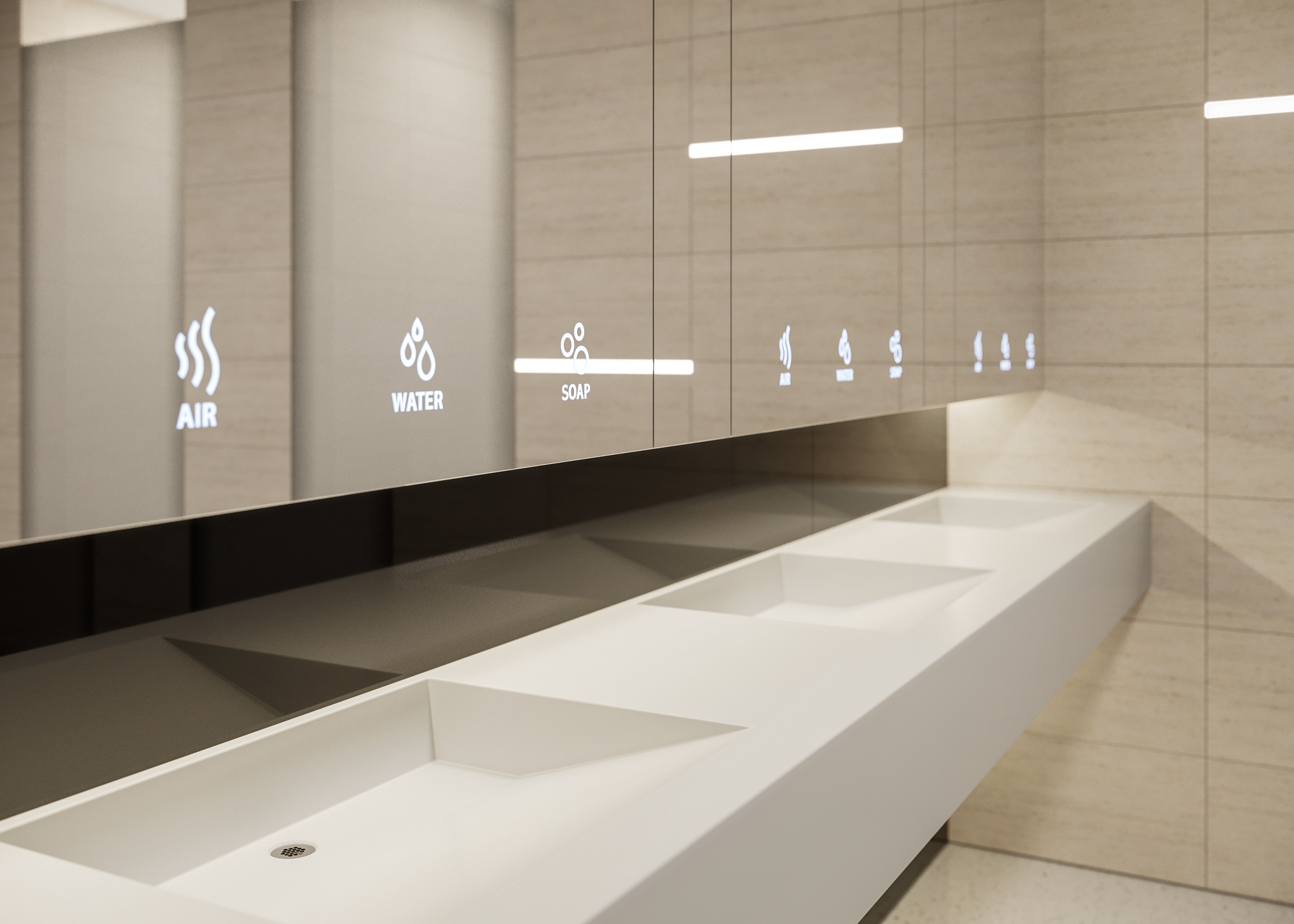 Stern’s behind-the-mirror solutions are designed for looks and function. The design is minimalistic and with a clean look, while having a robust and modern faucet, soap dispenser, and hand dryer all hidden behind the mirror.