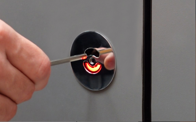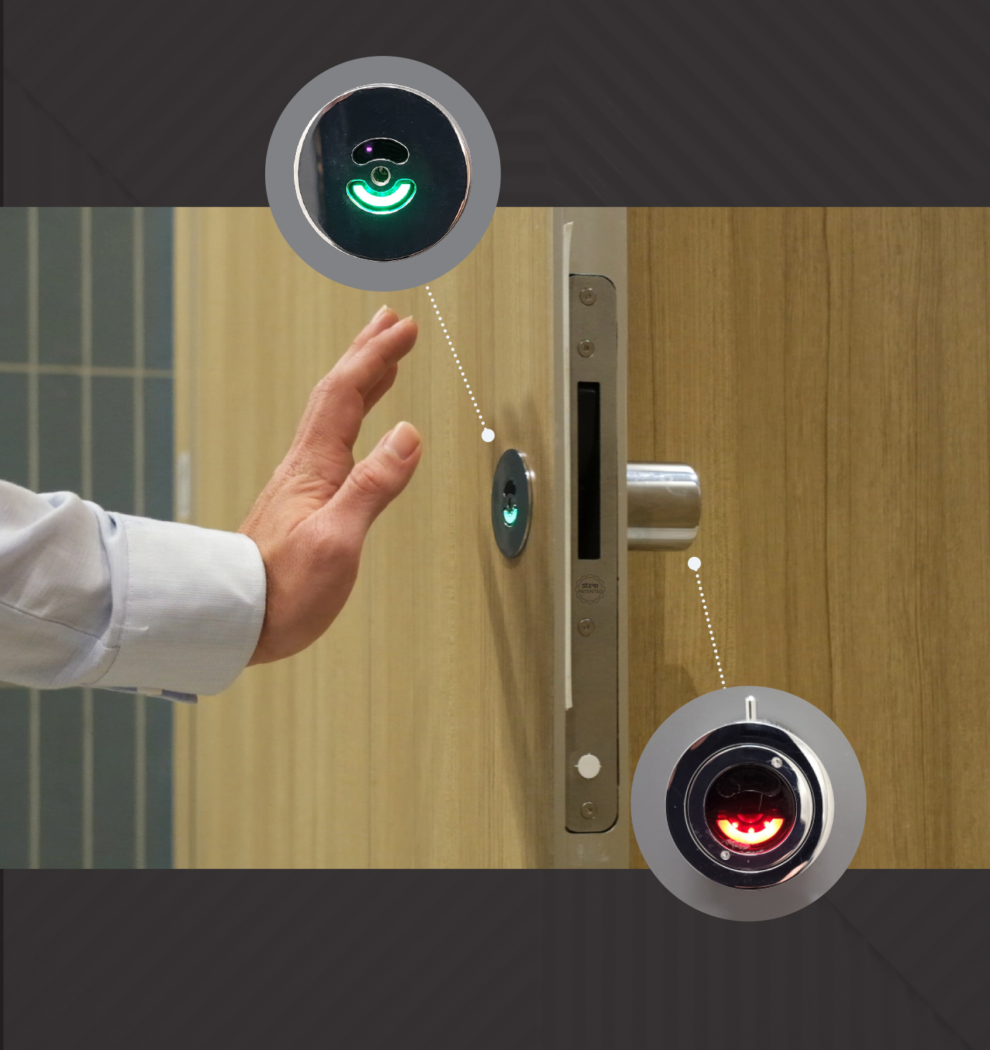 Sensor and LED indicatos are mounted on the exterior of the door, resembling standard door locks.