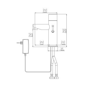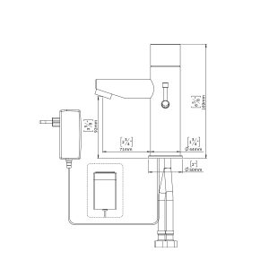 Touch-operated self-closing electronic lavatory commercial tap. For hot and cold water, includes a mixer for water temperature adjustment. Tall version for counter top washbasins. Long spout version. Filters included. The faucet will automatically shut off after a factory set flow time of 8 seconds. Flow time is adjustable on site. Latching solenoid valve is located above deck inside the product for added vandal protection.