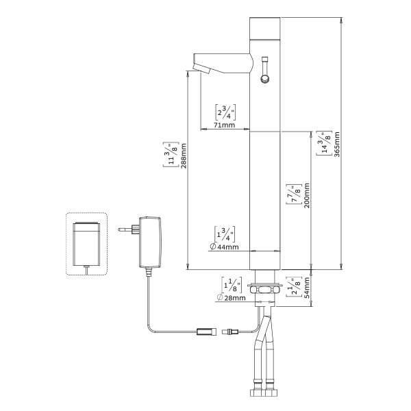 Touch-operated self-closing electronic commercial tap. Tall version for counter top washbasins. For hot and cold water. Filter included. The faucet will automatically shut off after a factory set flow time of 8 seconds. Flow time is adjustable on site. Latching solenoid valve is located above deck inside the product for added vandal protection.