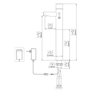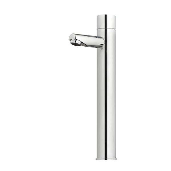 Touch-operated self-closing electronic lavatory commercial tap. For cold or premixed water. Filter included. Tall version for counter top washbasins. The faucet will automatically shut off after a factory set flow time of 8 seconds. Flow time is adjustable on site. Latching solenoid valve is located above deck inside the product for added vandal protection.