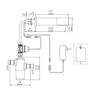 Touch-free wall-mounted electronic commercial tap. Activated by an infrared sensor. Short body version. For cold or premixed water. Chrome plated body, other finishes available. Adjustable setting by remote control: sensor range, security time, delay in, delay out, on-off and reset to factory settings.